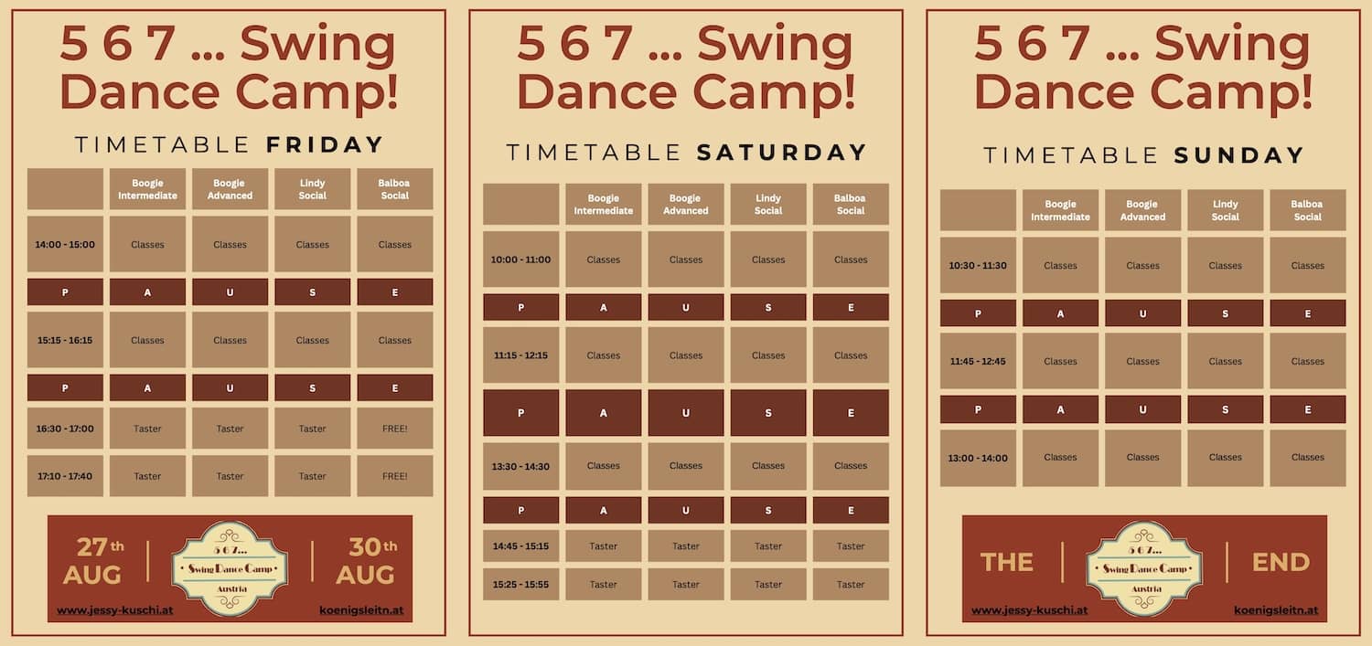 Tauche ein in ein unvergessliches Wochenende beim 5 6 7 Swing Dance Camp – mitreißend, musikalisch und voller Lebensfreude! Erlebe inspirierende Workshops mit internationalen TrainerInnen, tanze zu Live-Musik und genieße die besondere Atmosphäre einer leidenschaftlichen Swing-Community.